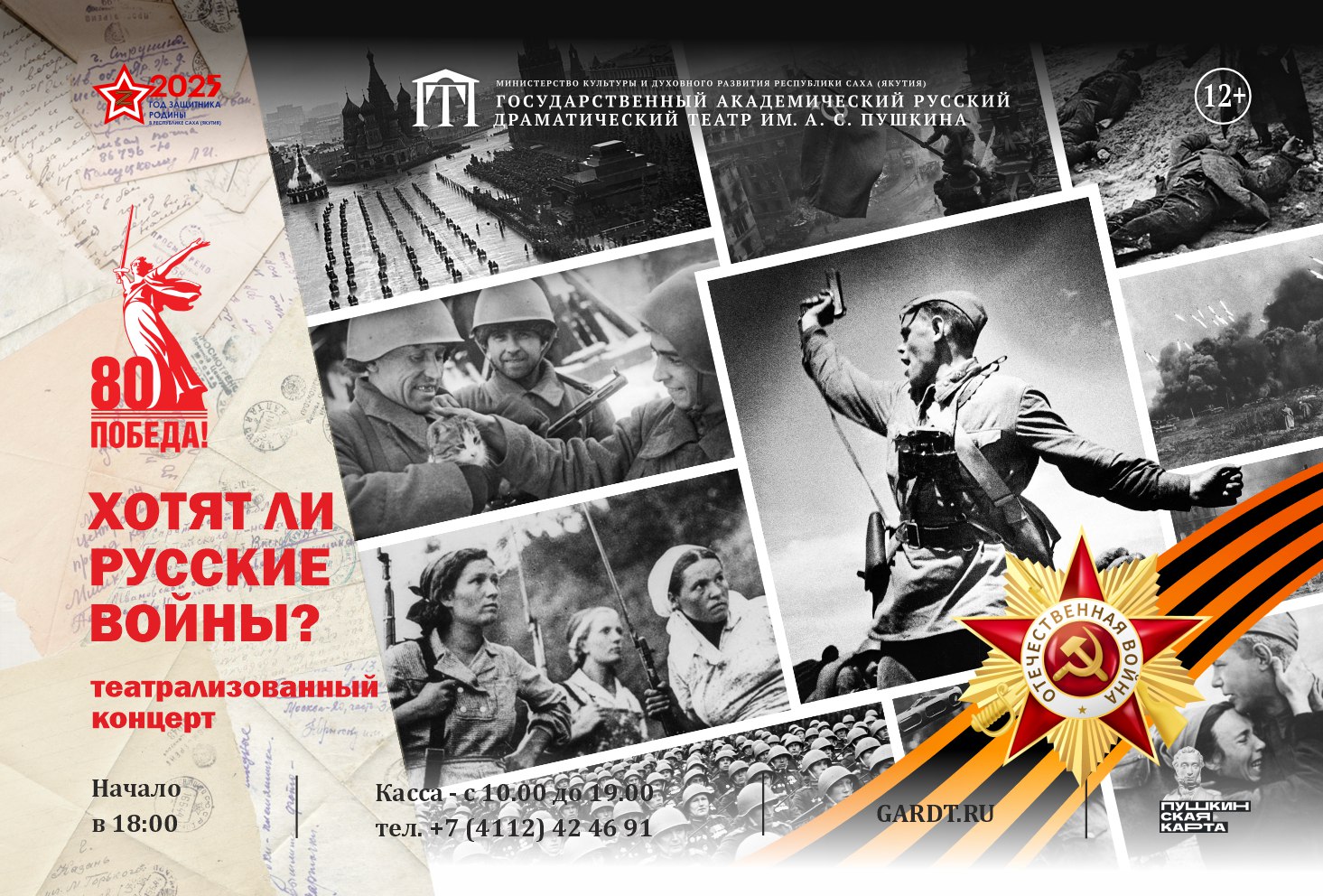 Традиционно к празднику Дня Победы — 9 мая, Русский театр им. А.С. Пушкина представляет новую театрализованную концертную программу, созданную на основе песен и стихов о войне, силе духа, патриотизме, дружбе… Это будет абсолютно новая музыкальная программа, которая сменит уже полюбившийся зрителям концерт «От героев былых времён». Концерт – размышление о судьбе рядового русского солдата и его родных, ждущих в тылу. Зрители услышат любимые песни в исполнении актёров Русского театра им. А .С. Пушкина и смогут вместе с артистами бережно пролистать одни из самых трагичных страниц истории нашей страны.