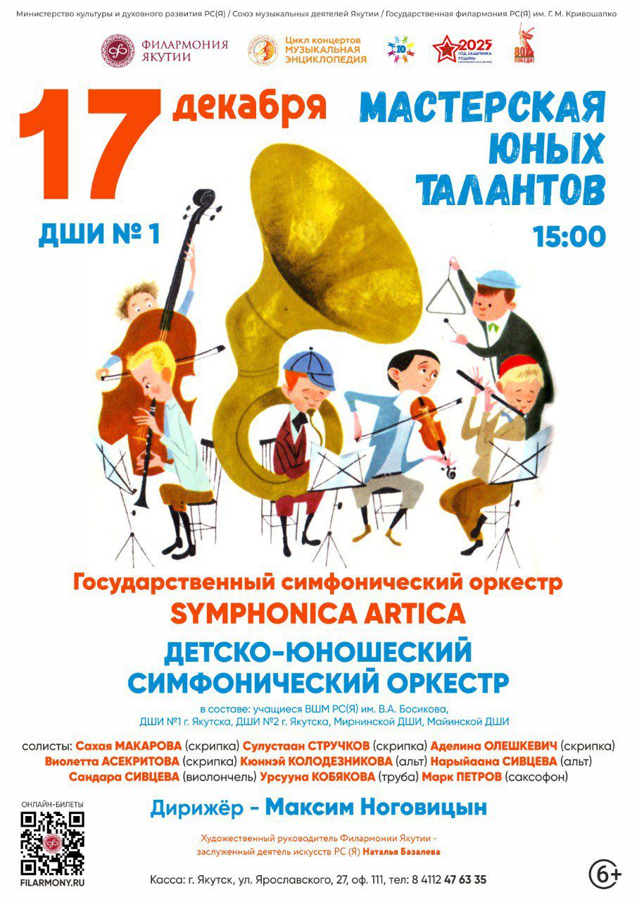На одной сцене встретятся Государственный симфонический оркестр Symphonica ARTica и будущее якутской музыкальной культуры — Детско-юношеский симфонический оркестр. Дирижер — Максим Ноговицын.