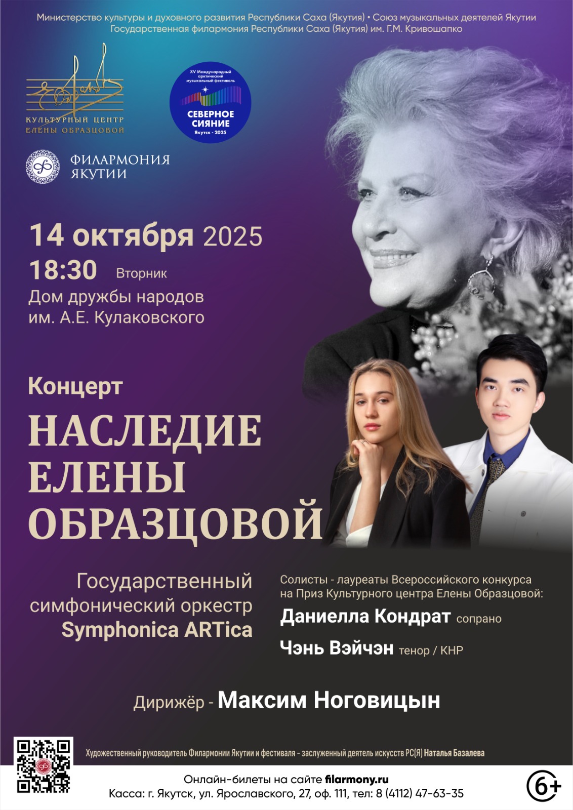 В рамках XV Международного арктического музыкального фестиваля «Северное сияние» Филармония Якутии приглашает на концерт Государственного симфонического оркестра Symphonica ARTica и лауреатов конкурса им. Елены Образцовой: Даниеллы Кондрат (сопрано, Россия) и Чэнь Вэйчэн (тенор, КНР).