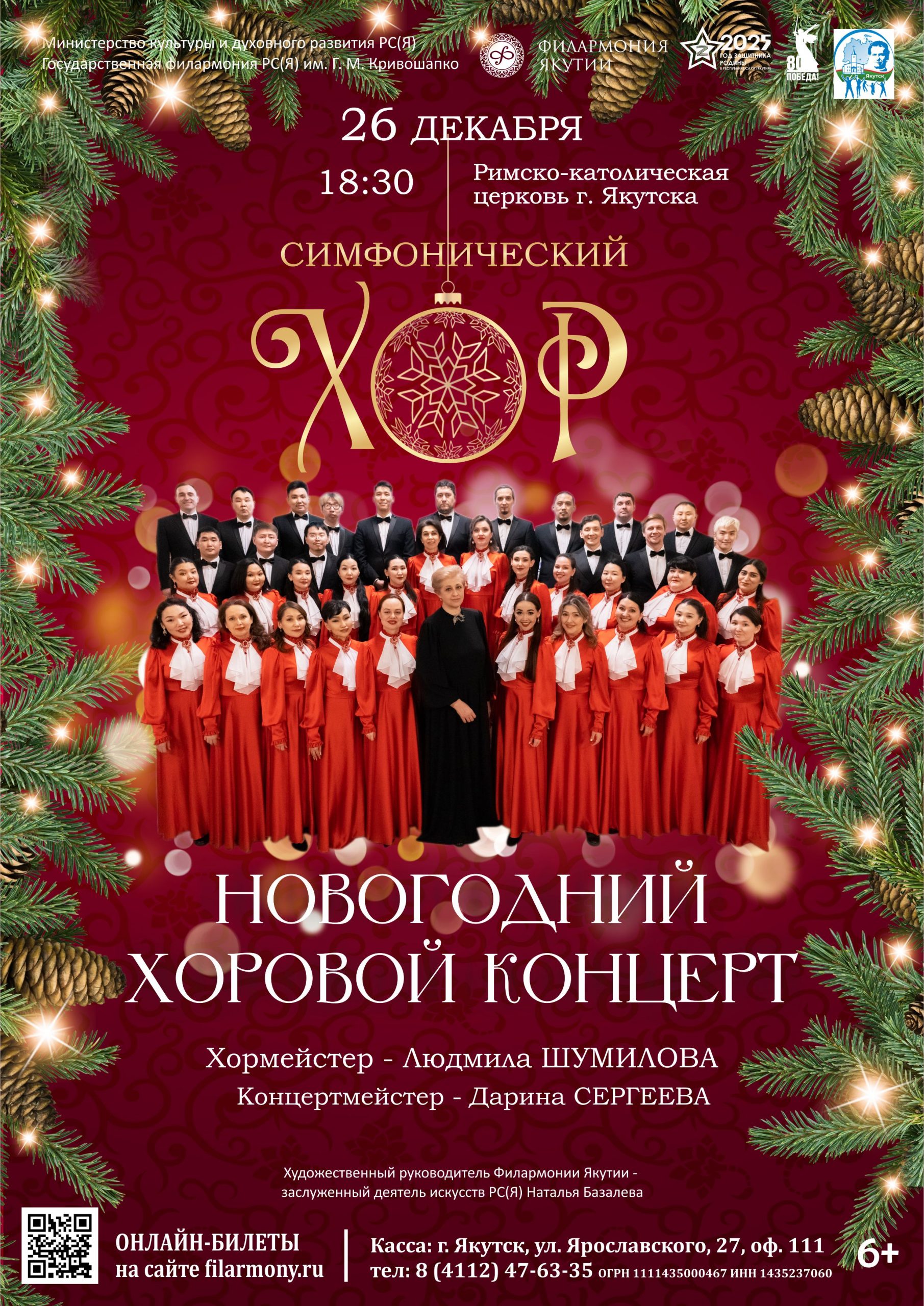 Симфонический хор под управлением заслуженного деятеля искусств РС(Я) Людмилы Шумиловой представит яркую программу, где шедевры мировой духовной музыки встретятся с любимыми мелодиями советского кино и современными рождественскими хитами.